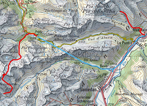 Route Jenatschhütte - Piz Laviner - Alp Mulix - Preda - Eisenbahn - Madulain - Alp Es-cha Dadour -Chamanna d'Es-cha