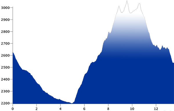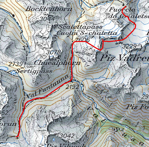 Von der Keschhütte Abfahrt durch das Val Tschüvel und Val Funtauna zur Alp Funtauna (2192m). Nun nach Norden dem Bachlauf entlang über P 2415 zum Scalettapass. Hier wendet man sich nach Osten über einen steilen Moränenhang in einer Talmulde und auf den Gletscher.